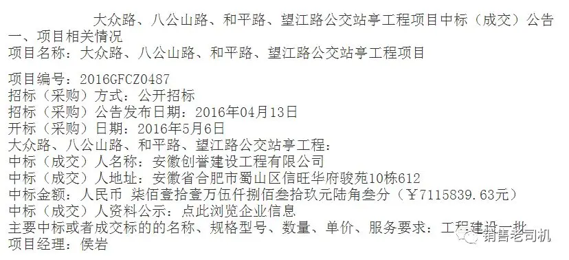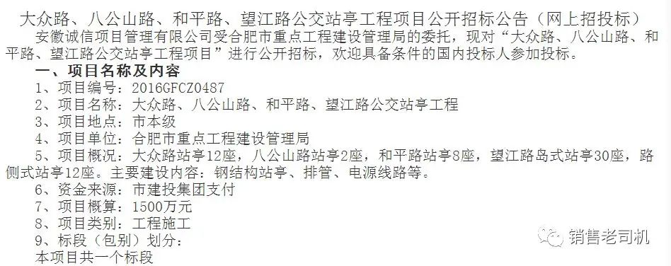 2016年4月13日,望江路公交站亭工程在網(wǎng)上進行了公開招投標,主要建設(shè)內(nèi)容為鋼結(jié)構(gòu)站亭、排管、電源線路等,預(yù)算價為1500萬元。